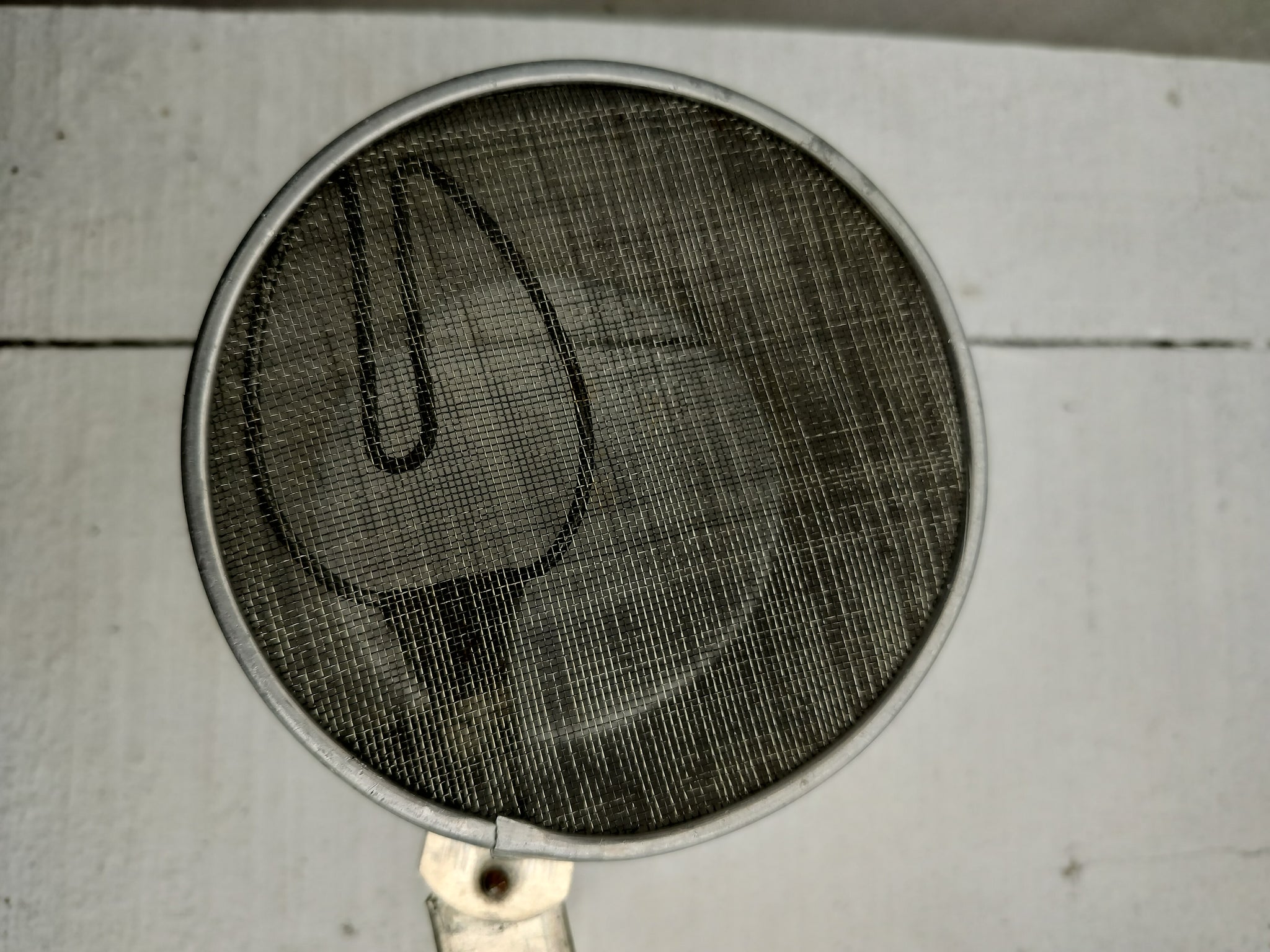 Gammelt sigtekrus i metal – med mål.