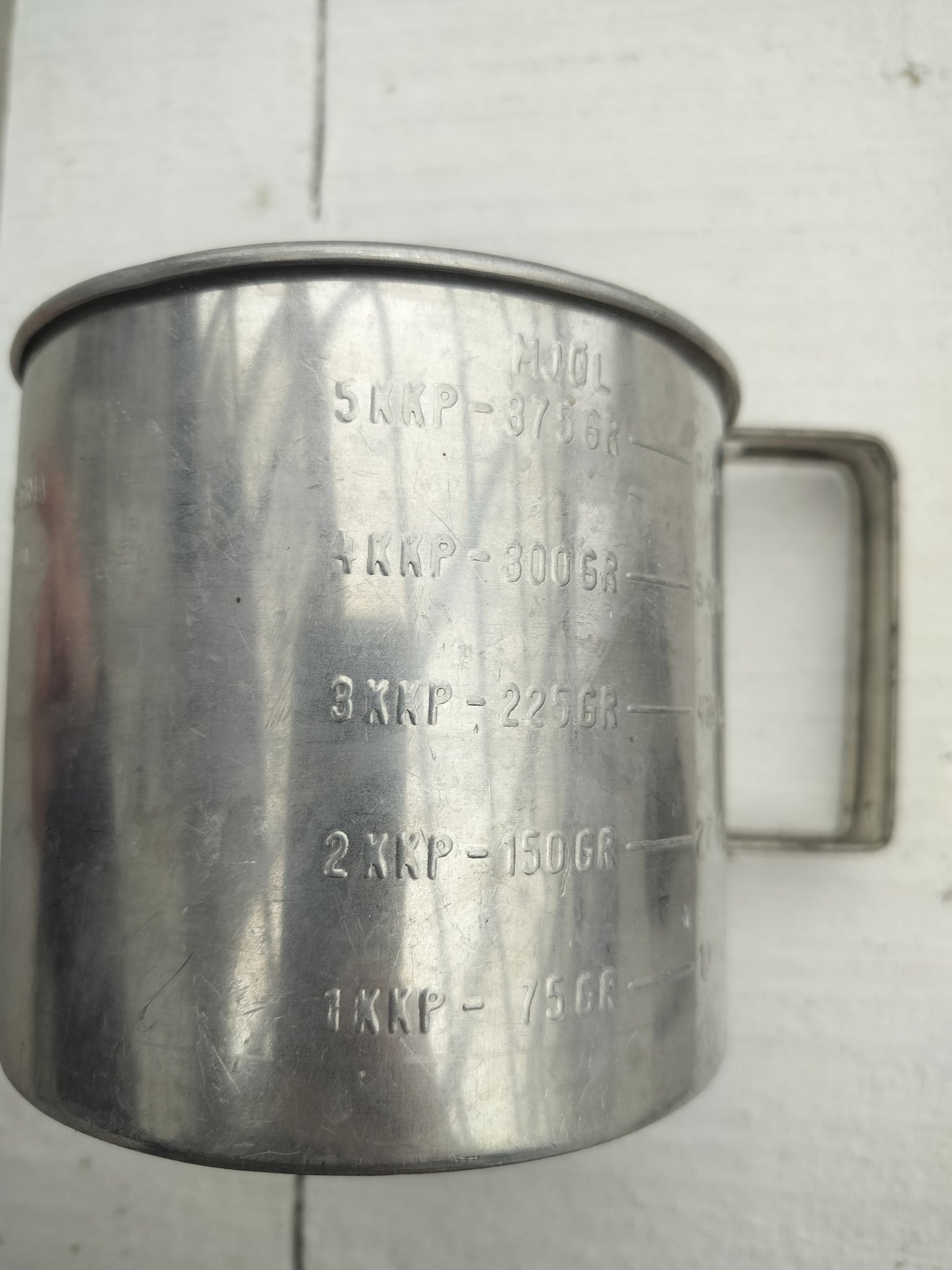 Smukt og funktionelt gammelt sigtekrus i metal med indbygget si og tydelige målangivelser.